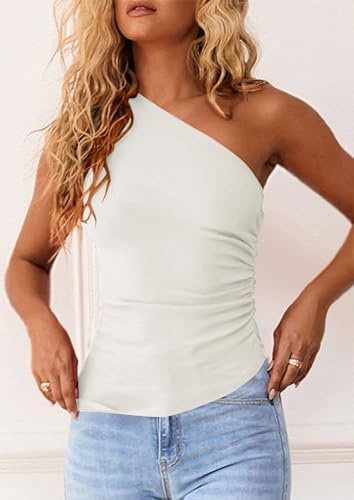 PRETTYGARDEN Womens 2025 Summer Y2K Tops Sleeveless One Shoulder Slim Fit Shirts Ruched Knit Asymmetrical Top Blouse