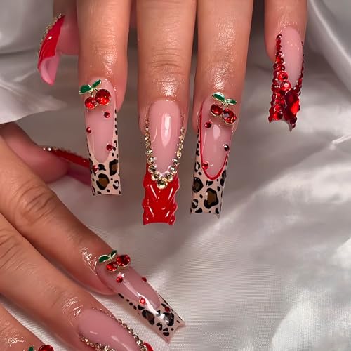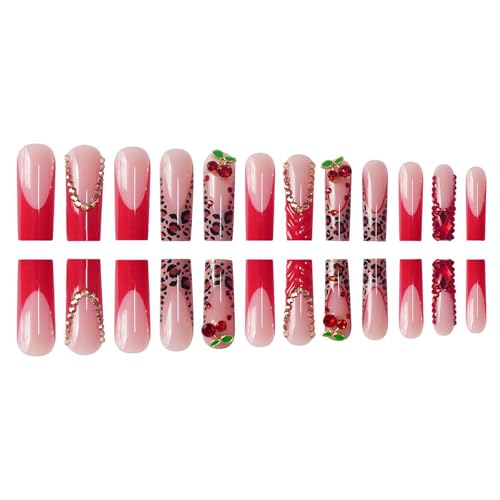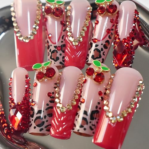 Red French Tip Press on Nails Long Square Fake Nails Glossy Glue on Nails with with Bow Charm Rhinestone Bling Acrylic False Nails Brown Cheeatah Artificial Nails Stick on Nails for Women