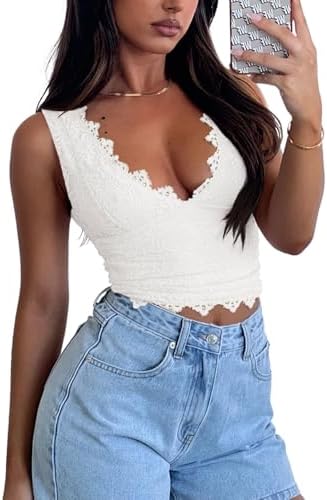 REORIA Womens Sexy V-Neck Sleeveless Double Lined Going Out Y2K Trendy Lace Cropped Tank Tops