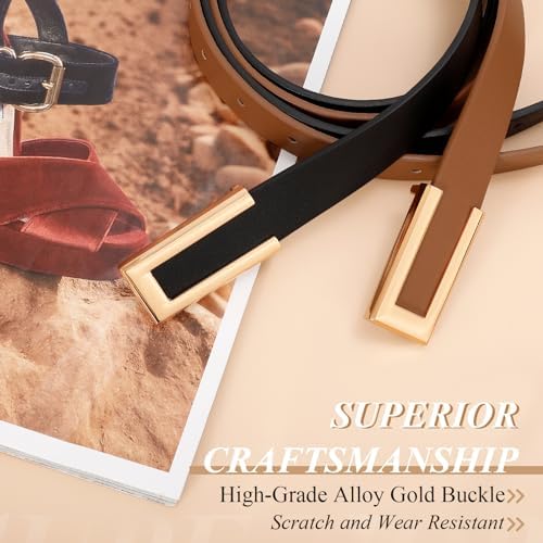 SANSTHS 2 Pack Skinny Leather Belts for Women, Ladies Thin Waist Belt for Dresses Jeans Pants with Gold Buckle
