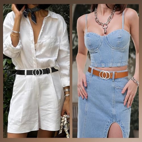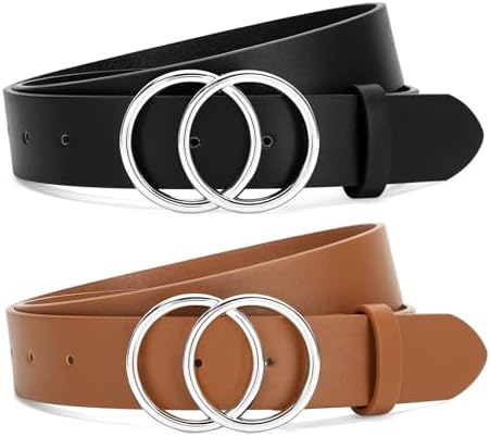 SANSTHS 2 Pack Women Leather Belts Faux Leather Jeans Belt with Double O Ring Buckle
