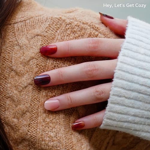 Semi Cured Gel Nail Strips | No LED Lamp Needed | Fall, Marble, Brown | Easy Apply & Remove, Salon Quality | Includes 28 Strips, 1 Prep Pads, Nail File & Wooden stick – Hey, Let’s Get Cozy