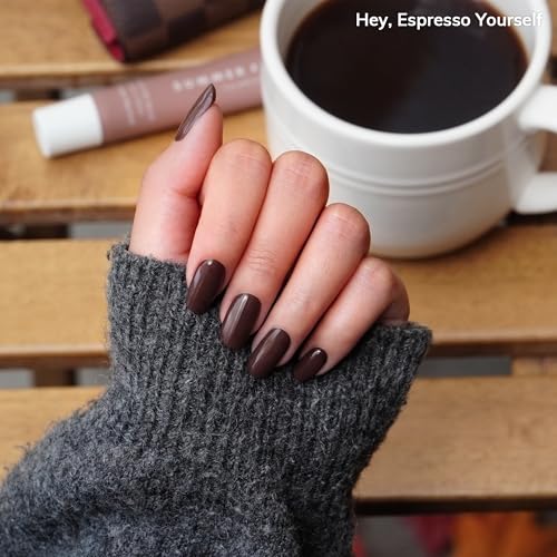 Semi Cured Gel Nail Strips | No LED Lamp Needed | Fall, Solid, Brown | Easy Apply & Remove, Salon Quality | Includes 28 Strips, 1 Prep Pads, Nail File & Wooden stick – Hey, Espresso Yourself