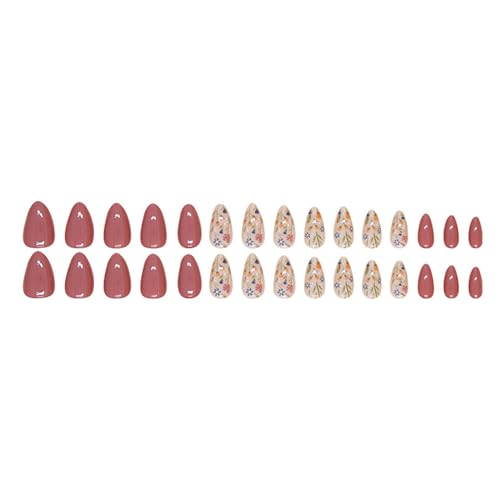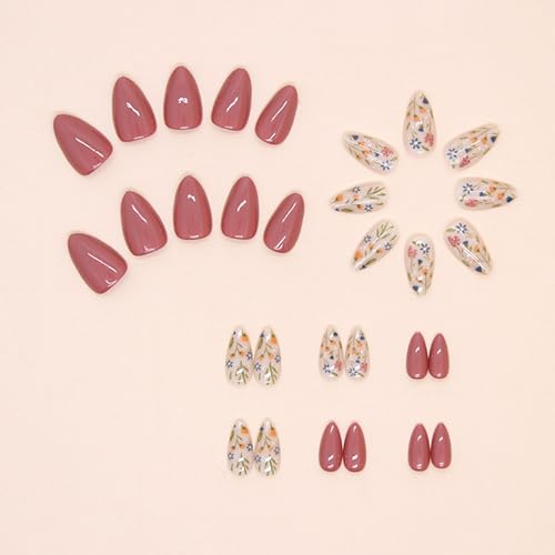 Short Press on Nails Almond Fake Nails Flower Acrylic Nails Fall Nails Press ons Full Cover Glue on Nails Cute False Nails Floral Stick on Nails for Women 30 Pcs, brown