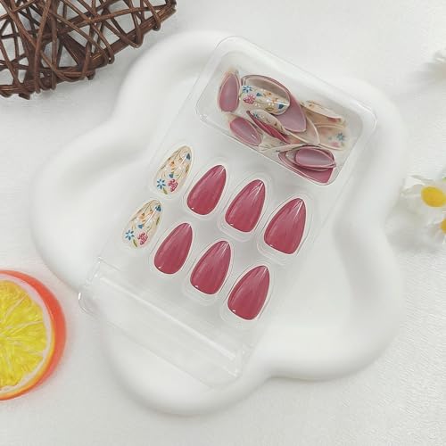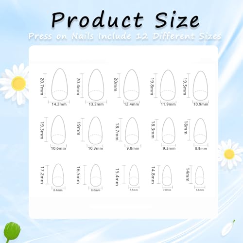 MAOTTIE almond fake nails contains 24 pieces full cover nails with 12 different sizes, 1*jelly glue stickers, 1*mini nail File, 1*wooden Stick, 1*cleaning pad. Polish and file to any shape and length you like.