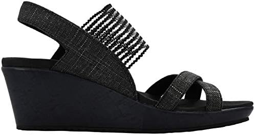 Soft sparkle linen and stretch fabric upper in a wedge heeled strappy slide comfort sandal with stitching accents and Luxe Foam Cushioned footbed.