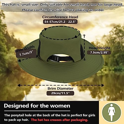 Ponytail Hole Design: The ponytail hole at the back of the hat is perfect for girls with long hair. This ponytail sun hat is designed to fit small-sized womens, with a circumference of 21.2″-22.5″, and a head height of 2.95”. Measuring your head circumference before purchasing is important to ensure a proper fit.