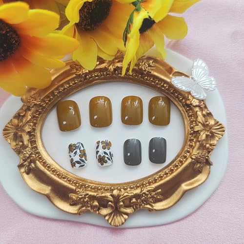 Square Press on Nails Short With Floral Designs – Yellow and Grey Acrylic Glossy Glue on Artificial Stick on Nails for Women – Fall Style – 24Pcs