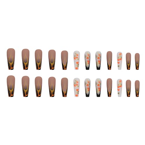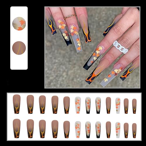 Thanksgiving Press on Nails Long Square Fall Fake Nails Black Nails Maple Leaf and Flame Designs Full Cover Stick on Nails False Nails Matte Transparent Nails for Women Girls 24 Pcs