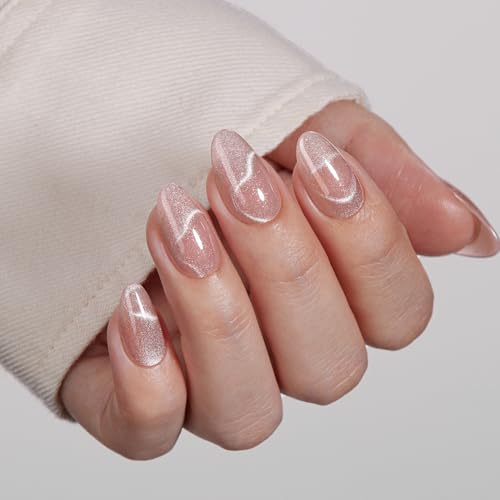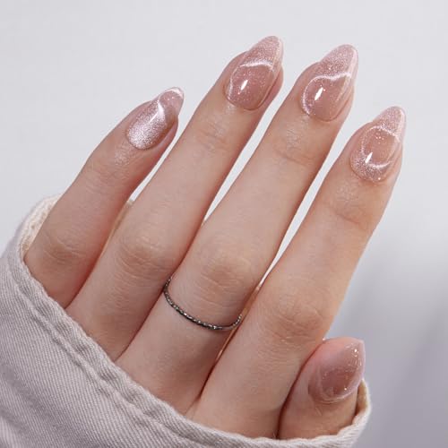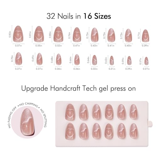 VSALON Press On Nails Short Almond, 32 Pcs 16 Sizes Nude Cat Eye Press On Nails Neutral Sparkly Fake False Nails With UV Glue On Nails Kit, Reusable Stick On Nails Fall Wedding Gifts For Women