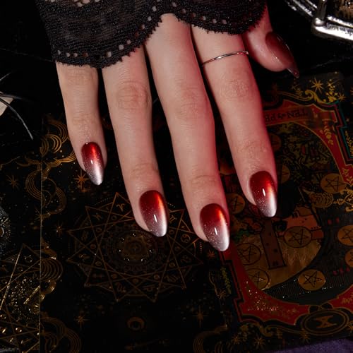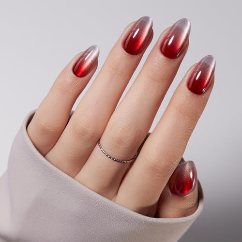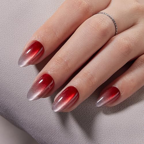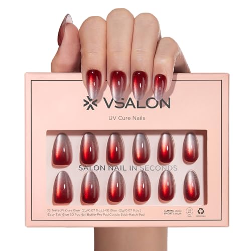 VSALON Press On Nails Short Almond, 32 Pcs 16 Sizes Red Cat Eye Press On Ombre Chrome Fake Nails With UV Cure Glue, Reusable Stick On Nails False Nails Kit Fall Wedding Gift For Women