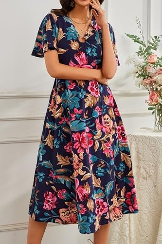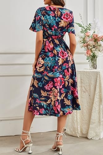 Women Casual Short Sleeve Empire Waist Summer Floral Mid Side Slit Navy Blue with Pink Flowers Dresses