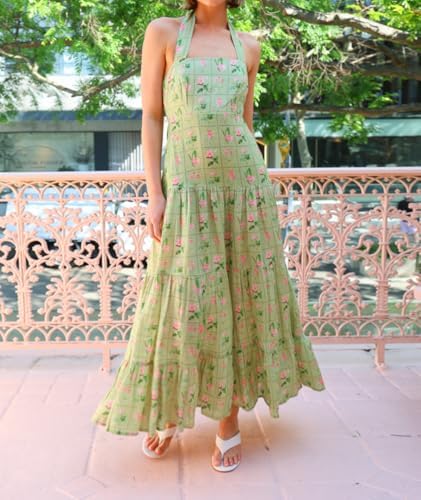 Women’s Cute Summer Boho Print Halter Neck Sleeveless Cut Out Backless Sexy Flowy A Line Maxi Dress
