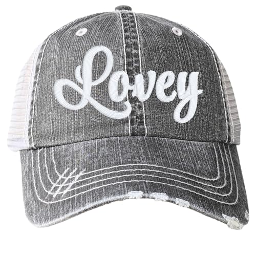 Distinct Headwear women’s embroidered Lovey or custom text mesh back adjustable baseball cap with standard ponytail hole. Optional clear rhinestones can be added in the customization area. One size fits most with a lower to mid profile fit on most customers. Adjustable hook and loop closure back. Soft and flexible distressed dark grey cap with fully embroidered design in white thread. Embroidered in the US – made to order. If adding rhinestones, all rhinestones are clear and adhered to the bill with a heat based adhesive for a strong bond.