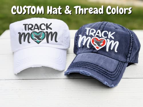 Women’s distressed, 100 percent cotton, embroidered track mom baseball cap. Your choice of cap color and thread colors. Optional upgrade to a high ponytail/messy bun cap. Ladies fit, soft, mesh-free cap with matching faux leather back buckle on all caps except the white and navy high ponytail caps. White and navy high ponytail caps have a fabric back strap. All straps on all hats are adjustable. Handmade in the US – made to order.