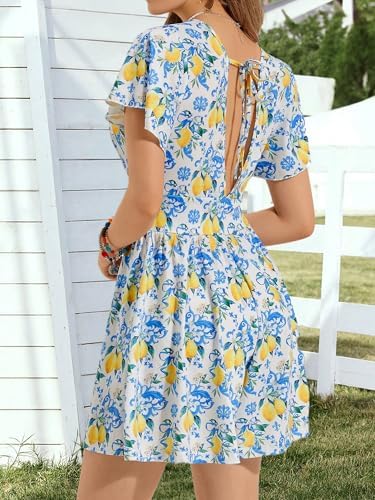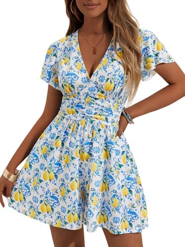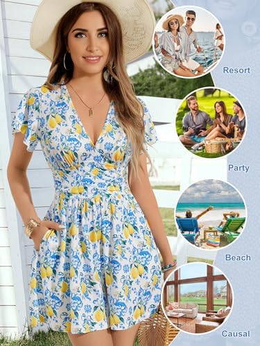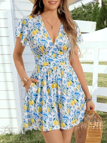 ZABERRY Women’s Back Lace Up Floral Rompers with Pockets Short Ruffle Sleeve Summer Jumpsuits Wide leg Outfit
